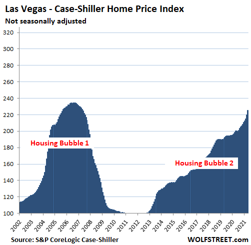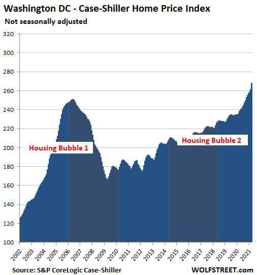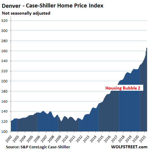 House prices jumped by 3.2% in April from March, after having jumped by 3.4% in March from February, and are up 21.6% year-over-year, the second-hottest annual house price increase behind Phoenix. Prices have soared 231% since 2000: