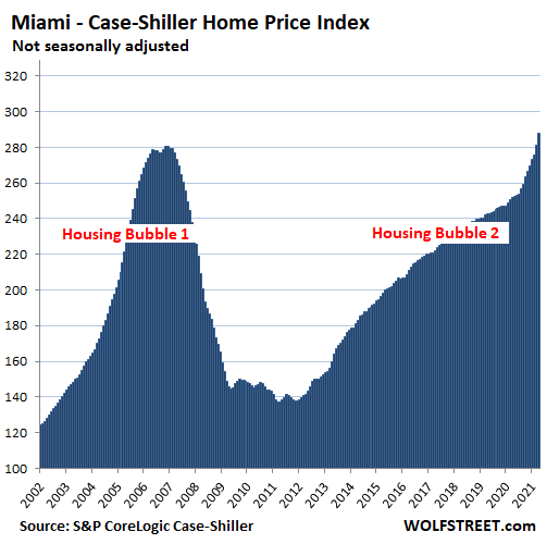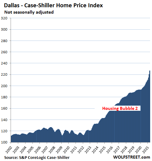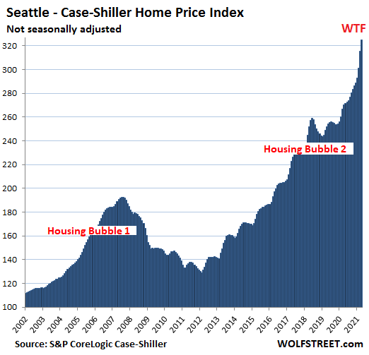 House prices soared by 14.6% from a year ago, according to the National Case-Shiller Home Price Index, the biggest increase in the data going back to 1987. But it pales compared to the raging mania that has taken hold of individual metros.