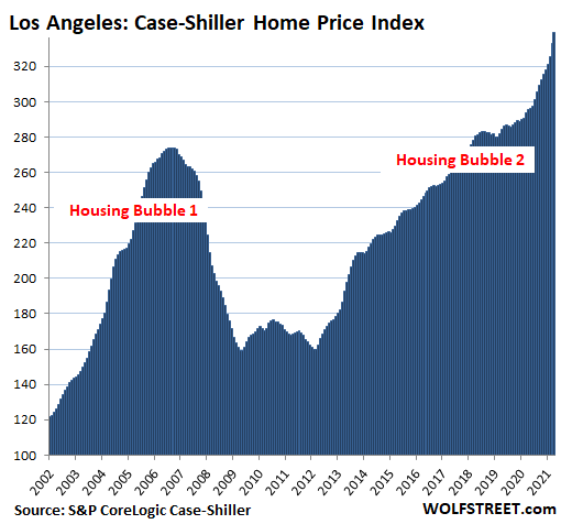 Prices of single-family houses in the Los Angeles metro jumped by 1.8% in April from March and by 14.7% year-over-year. All Case-Shiller Indices were set at 100 for January 2000. The index value for Los Angeles of 339 indicates that house prices soared by 239% since January 2000, despite the collapse during the Housing Bust, which makes Los Angeles the most splendid housing bubble on this list.