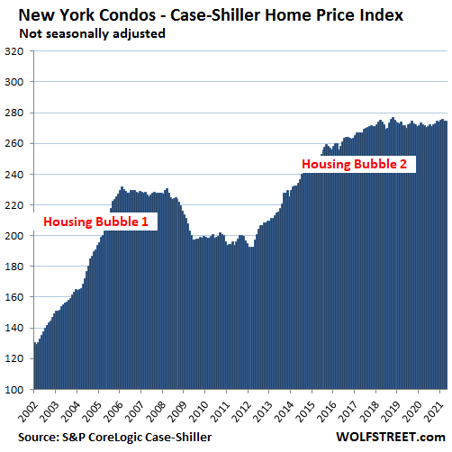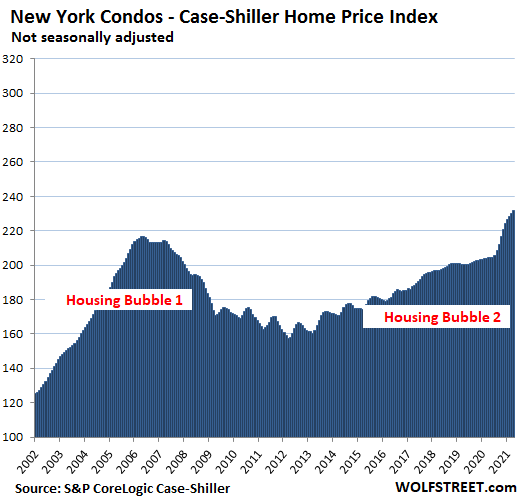 House prices in the New York metro rose 0.8% in April from March and are up 13.5% year-over-year. It took the index 15 years to surpass the peak of Housing Bubble 1: