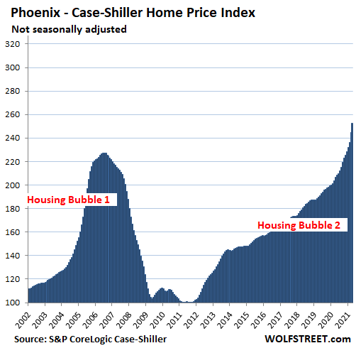 The Case -Shiller index for the Phoenix metro spiked 3.3% in April, after having spiked 3.4% in March, and is up 22.3% year-over-year, the biggest year-over-year increase in Phoenix since the peak months of the insane bubble days in 2005, and the hottest annual house price inflation among the Most Splendid Housing Bubbles here:
