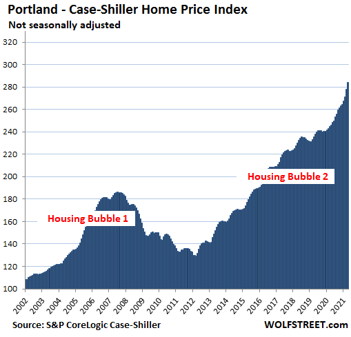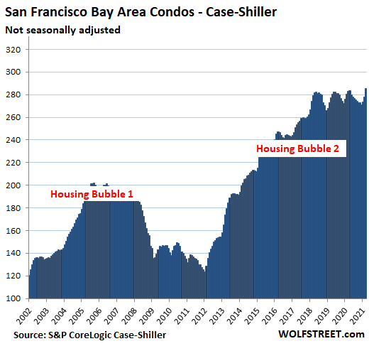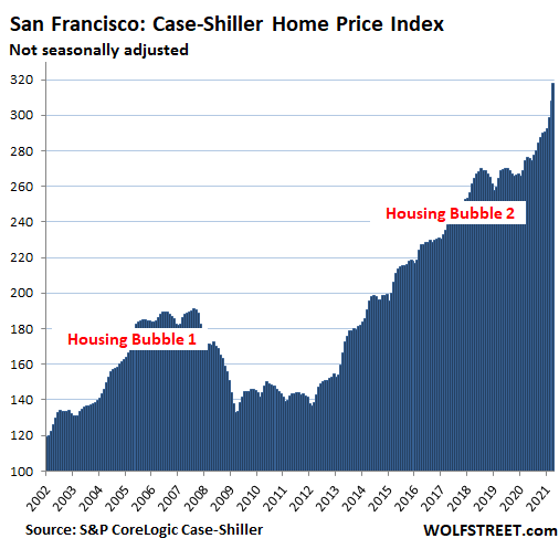 The Case-Shiller Index for “San Francisco” – it covers the five counties of San Francisco, San Mateo, Alameda, Contra Costa, and Marin – spiked by 3.1% in April after having spiked by 3.3% in March, and is up 15.1% year-over-year. House prices have skyrocketed 218% since 2000.