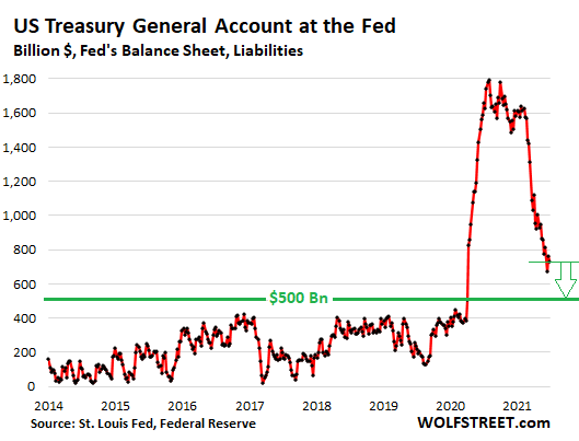 But the government didn’t spend that $3 trillion that it had raised. The unspent amounts remained in its checking account, the “Treasury General Account” (TGA) at the Federal Reserve Bank of New York, which peaked at $1.8 trillion in July 2020.