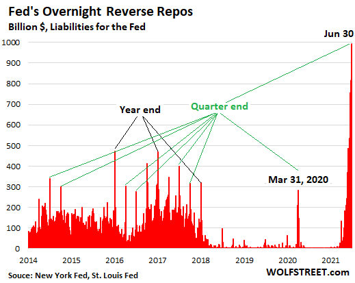 Back on June 9, when discussing the Fed’s gigantic cash-drain operation via overnight “reverse repos,” I mused in our illustrious comments: If the Fed at its June meeting doesn’t tweak its offering rate for overnight reverse repos and the interest rate on excess reserves (IOER), “my guess is that by June 30 (end of quarter), it” – the amount of overnight reverse repos – “could spike to $1 trillion.” The Fed then increased these two rates by 5 basis points. And today, that cash-drain operation shot up to nearly $1 trillion.