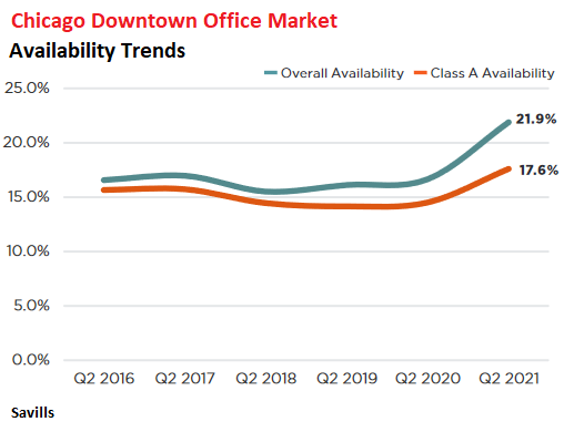 Leasing volume, at 1.1 msf in Q2, was down 60% from Q2 2019. Asking rents have been about flat since 2019. But Savills says, “tenants should generally expect owners that are facing significant pockets of availability in their portfolios to be generous with concessions and flexible with lease terms.”