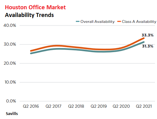 The Houston office market is huge, with 192 million square feet (msf) of office space. Of this space, 31.3% are currently on the market available to lease, according to Savills. In terms of Class A office space, 33.3% is available for lease.