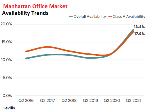 Availability jumped to 18.4% overall and to 17.9% for Class A buildings. By submarket, availability ranged from 12.3% in Hudson Yards to 25.8% in Soho.