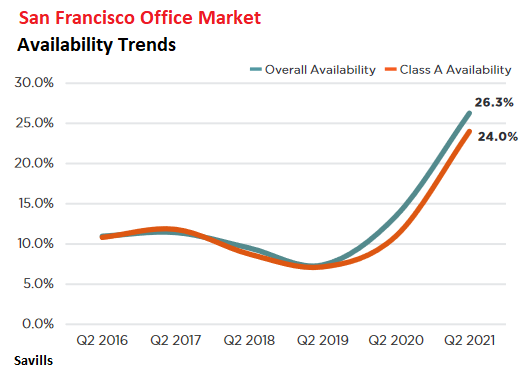 Houston has been the hardest-hit major office market in the US since the oil bust collided with a phenomenal office construction boom in 2015. Availability rates soon were over 20%. But in Q2 2021, they’re over 31% — meaning that nearly one third of the office space is sitting on the market! And San Francisco, three years ago the hottest and tightest office market in the US, is now coddling up to Houston, with a historic office glut.