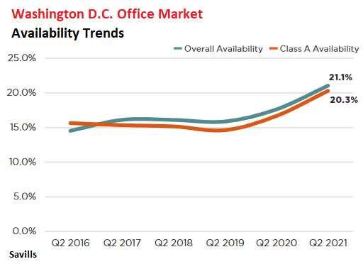 Overall availability rose to a record 21.1% in Q2. This includes 2.5 msf in new developments, of which less than half are preleased, with some projects having seen no preleasing. By submarket, availability ranges from 10.3% in NoMa and 13.1% in Southwest – the only two submarkets with availability rates below 20% – to 26.9% in Capitol Riverfront: