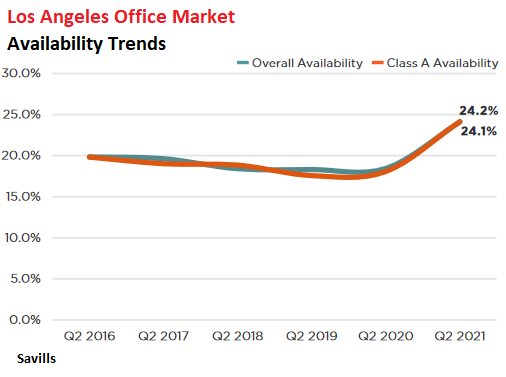 Sublease space rose to an all-time high of 9.2 msf, and total availability rose to 24.1%. By submarket, availability ranged from 8.8% in Burbank to 38.0% in Fox Hills/Marina: