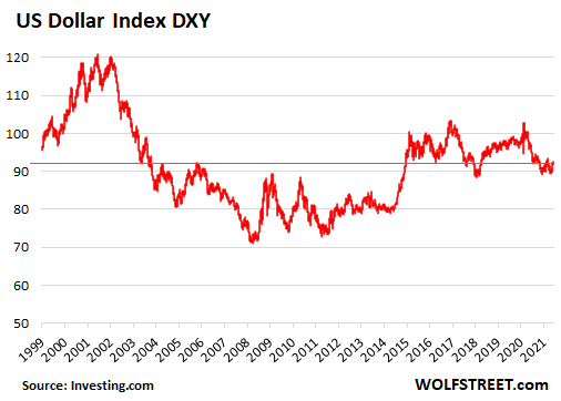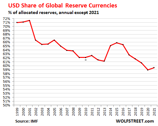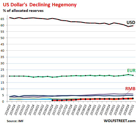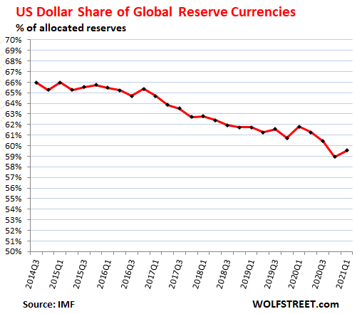 The global share of US-dollar-denominated exchange reserves ticked up to 59.5% in the first quarter of 2021, after having dropped to a 25-year low in Q4 2020, according to the IMF’s Composition of Official Foreign Exchange Reserves (COFER) data released at the end of June. Dollar-denominated foreign exchange reserves are Treasury securities, US corporate bonds, US mortgage-backed securities, US Commercial Mortgage Backed Securities, and other dollar-denominated financial assets held by foreign central banks. Q1 was a ripple in the long-term trajectory.