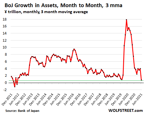 The three-month moving average of its monthly QE purchases shows the ongoing trend: In April, May, and June, its total assets increased by an average of only ¥0.78 trillion per month, the smallest increase since the beginning of Abenomics in 2012: