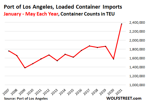 The Port of Los Angeles has been setting records in terms of the volume of imported loaded containers. The container volume is expressed in the standard measuring unit of TEU (Twenty-foot Equivalent Unit), where a 40-foot container counts as 2 TEU. For the five months from January through May, the port imported 2.37 million TEU in loaded containers, according to data from the Port of Los Angeles. This was up 26% from the prior record period of January-May 2017: