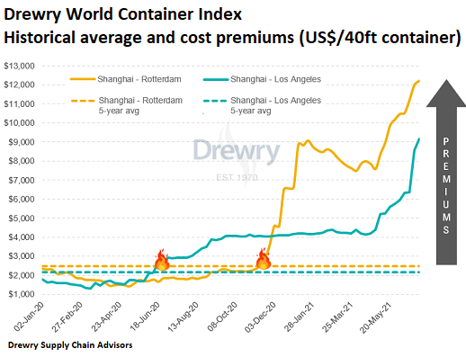 Drewry calls this phenomenon a “market shock” that started in June 2020 for the Asia-US trade, shortly after the stimulus money started flooding into commerce; and that started in December 2020 for the Asia-Europe trade. The two starting points are indicated by the flames. The five-year averages are indicated by the dotted lines (chart via Drewry Supply Chain Advisors):