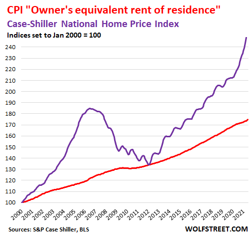 The Case-Shiller Home Price Index, which measures the price changes over time for the same house and is therefore an appropriate measure of house price inflation, spiked by 14.6% year-over year, the red-hottest increase in the data going back to 1987 (purple line). This contrasts with the languid CPI for homeownership (red line):