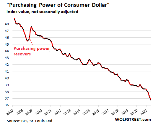 There is nothing “transitory” or “temporary” about the loss of purchasing power as the chart above shows. Only a period of deflation can reverse some of the drop in purchasing power, which is a rare event in the US and happened only a few quarters over my life time, including for several months in 2008 – that little notch in the chart above.