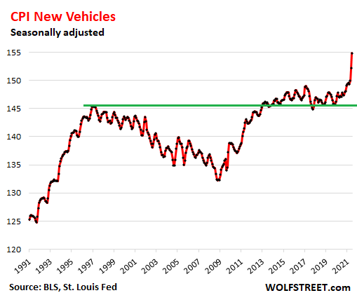 New Vehicle CPI takes off. In June, the CPI for new cars and trucks jumped by 1.8%, after having jumped by 1.5% in May, the biggest month-to-month jumps since the cash-for-clunkers program kicked in during the Great Recession. The index is now up 5.3% year-over-year. Even the aggressive application of hedonic quality adjustments, that pushed down the new vehicle CPI even as vehicle prices rose in reality, cannot keep up with those price increases: