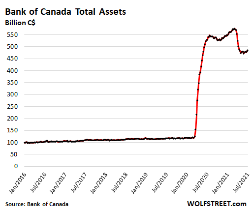 Unwinding the liquidity facilities caused a sharp drop in the total assets at the Bank of Canada, from C$575 billion in March, to C$484 billion as of the latest reporting week through July 7, even as the purchases of GoC bonds continued at a much slower pace. GoC bonds now account for C$400 billion of the total.