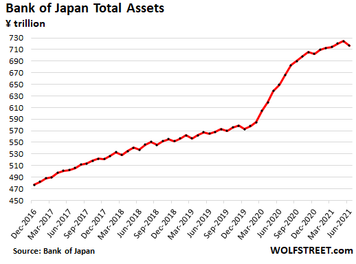 The Bank of Japan, one of the biggies, has been tapering its asset purchases for months. By June, its total assets, after months of slowing growth, fell by ¥7.7 trillion ($70 billion) from May, to a still gargantuan ¥717 trillion ($6.5 trillion):