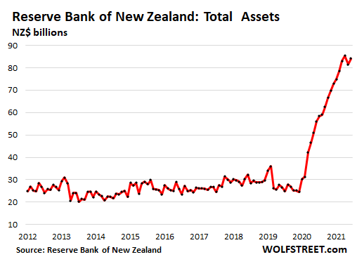Compared to the giants, New Zealand is small, and the Reserve Bank has a small balance sheet, but its QE program was massive, ballooning its total assets by 230% between December 2019 and June 2021, to NZ$84 billion.
