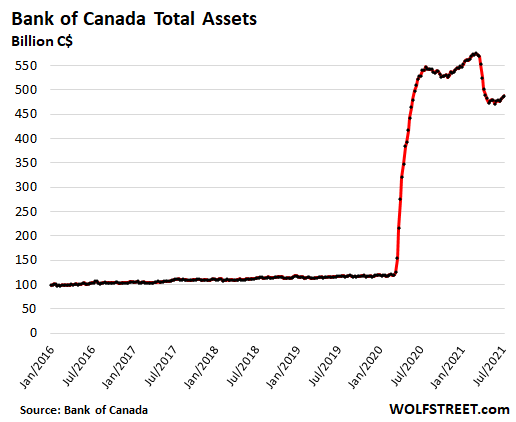 Starting last October, the Bank of Canada began the process of ending its asset purchases. Since then, it stopped buying mortgage-backed securities, unwound its holdings of repos and Treasury bills, and cut the amount of its weekly purchases of Government of Canada bonds for the third time, from C$5 billion per week last year to C$2 billion per week now. The assets on its balance sheet dropped from C$575 billion in March to C$487 billion as of last week. And in its pronouncements, the housing bubble looms large.