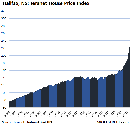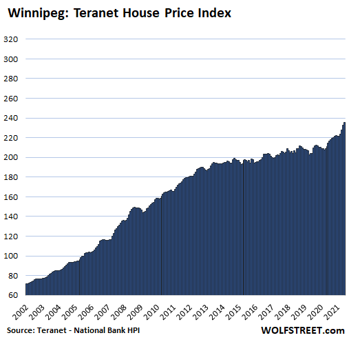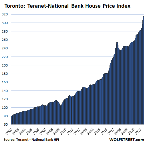 The Teranet-National Bank House Price Index tracks prices of single-family houses through “sales pairs,” similar to the Case-Shiller Home Price Index in the US, comparing the price of a house that sold in the current month to the price of the same house when it sold previously. Since it tracks how many more Canadian dollars it takes to buy the same house over time, it is a measure of house price inflation.