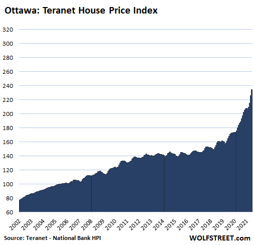 In Ottawa, house prices spiked by a whopping 4.0% for the month (48% annualized!) and by 25.8% year-over-year. But wait, that crazy 4.0% increase in June was down from the scary-crazy increase of 4.9% (59% annualized) in May: