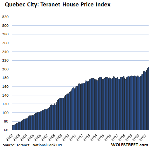 In Quebec City, house prices rose 1.3% for the month and by 10.8% year-over-year: