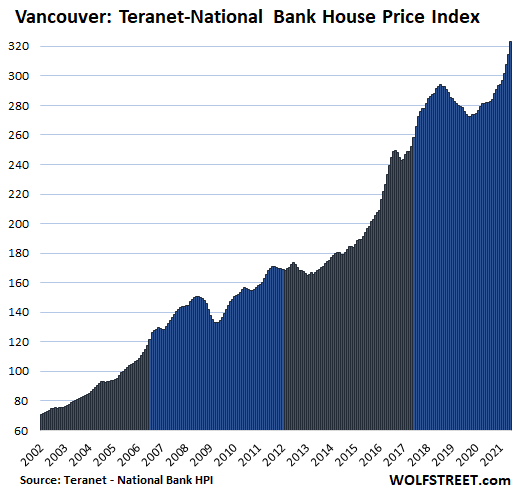 In Greater Vancouver, house prices jumped by 2.7% in June from May and are up 14.7% year-over-year, according to the Teranet-National Bank House Price Index today. Note how the Bank of Canada’s radical monetary policies starting in March 2020 turned around Vancouver’s housing bust that had already been under way for a couple of years: