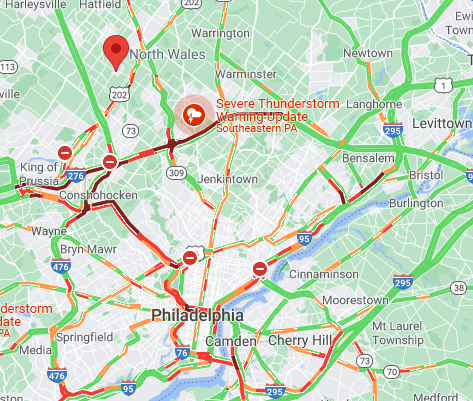 Wait… North Wales is not “rural” out in the boonies, it’s a suburb within the Philadelphia metropolitan area. This here is a typical suburban mall, and it looks like North Wales has got a traffic jam right now on 202 and 309: