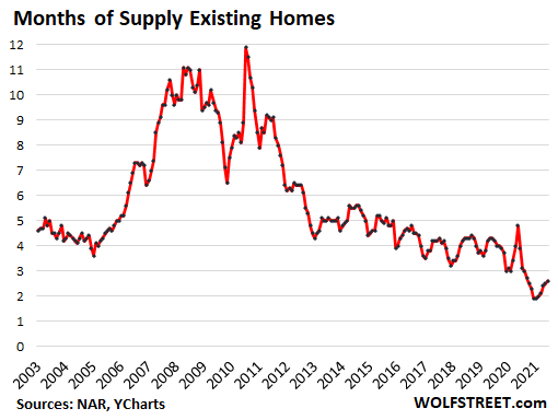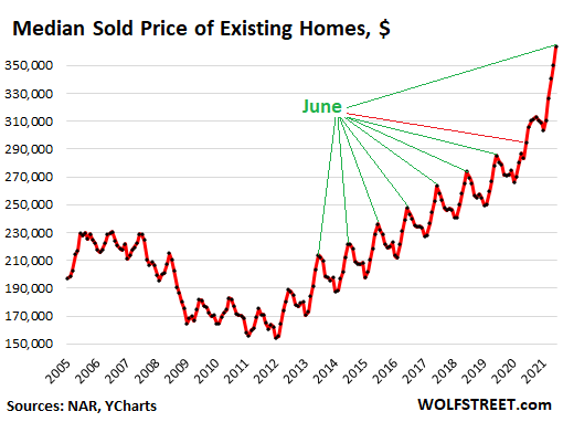 Crazy Spiking Prices continued. The median price for existing homes spiked by 23.4% in June, compared to June last year. The previously typical seasonal fluctuations have been completely abolished since March 2020, an indication of just how upended the housing market has become.