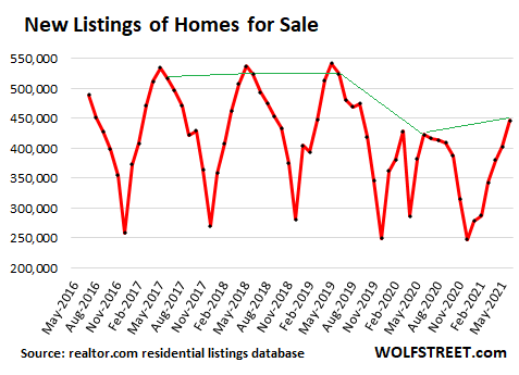 New listings rose by 11% in June, from May, when they normally, in the pre-pandemic years, declined from May, May being the seasonal peak of the year for new listings. But not this year: 446,600 new homes were listed for sale in June, up 11% from May, and the most since September 2019, according to the realtor.com residential listings database (the Junes are connected by a green line):