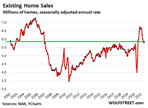 Sales of existing homes of all types ticked up 1.4% in June from May, after the prior steep declines, to a seasonally adjusted annual rate of 5.86 million homes, below July 2020, the month when the pandemic spike in home sales began, having now mostly unwound the spike that started last summer (historic data via YCharts):