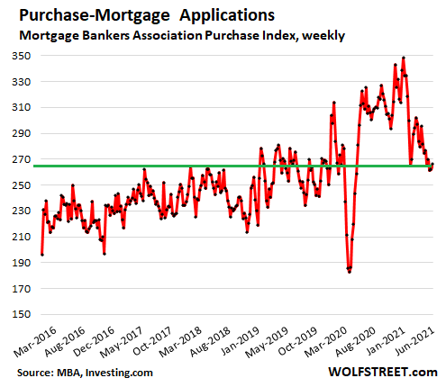 Investors and cash buyers were big, but mortgage applications dropped to 2019 levels. In June, 23% of the sales were all-cash, same as in May, and up from a share of 16% in June 2020. This includes institutional investors that can borrow at the institutional level, instead of via mortgages for each home, and it includes individual investors and second home buyers that have the cash, or can borrow against their portfolio, and get a mortgage later.