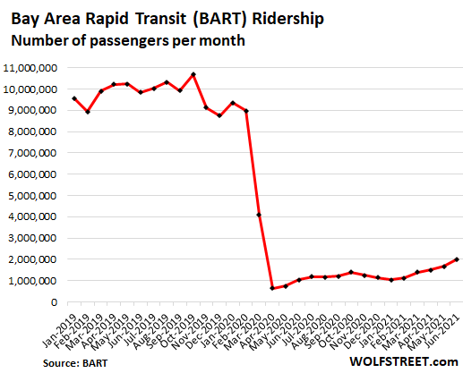 But ridership on the Bay Area Rapid Transit (BART) system in June was still down 80% from June 2019. It’s ticking up from the lows, but the trains are still nearly empty – even as brand-spanking new trains are making their sporadic appearance: