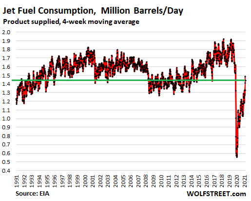 And people are not flying as much. They’re flying a lot for leisure within the US, but they’ve cut business travel such as going to conventions, and they’ve cut international travel for business and leisure, given the travel restrictions. The EIA reported that the four-week moving average consumption of kerosene-type jet fuel, at 1.44 million barrels per day, was still down 22% in the latest reporting week compared to the same period in 2019:
