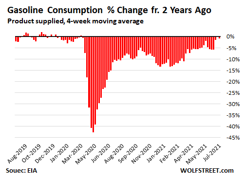 The four-week moving average – which irons out some of the week-to-week fluctuations – in the week of July 9 was flat with the same week in 2019; and for the most recent reporting week of July 16, it was down 0.9% from 2019. Demand for gasoline has now fully recovered.