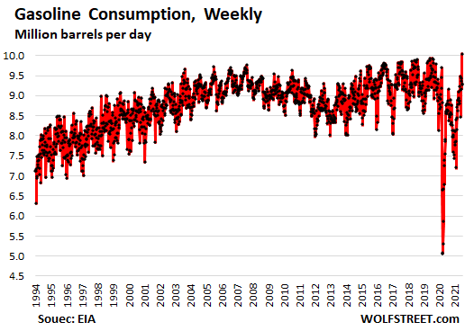 Gasoline consumption set a new all-time record for a one-week period during the first week in July, at just over 10 million barrels per day, a figure never seen before, up 3.0% from the same week in 2019, and up 15% from the same week in 2020, according to EIA data. This is just gasoline and does not include diesel.