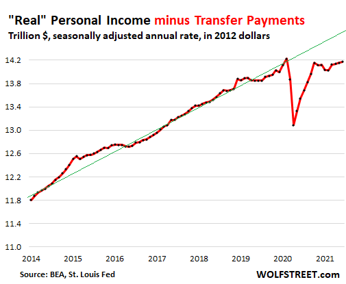 “Real” (inflation adjusted) personal income without transfer payments: Personal income – including income from interest, dividends, rental property, etc. – but without stimulus payments, unemployment payments, and other transfer payments from the government, and all of it adjusted for inflation, was still below where it had been in February 2020, according to the Bureau of Economic Analysis today.