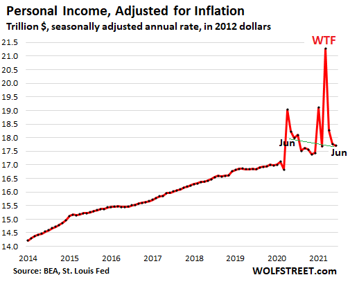 But adjusted for inflation, personal income from all sources fell 0.4% in June from May, and was down 1.6% from June last year. The three spikes in the chart reflect the three waves of stimulus payments that created some of the weirdest distortions in the US economy ever. But the stimulus effects are now fading