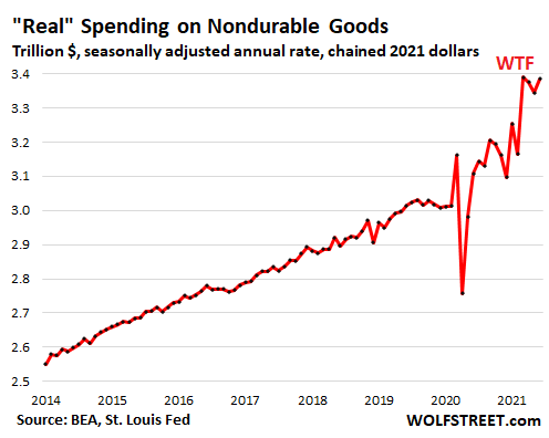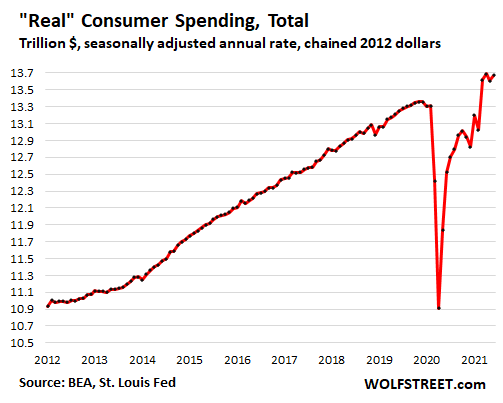 This consumer spending data for June was largely incorporated into the GDP data for the second quarter, released yesterday: All this stimulus, so little to show for. Read… Socked by 6.4% Inflation, Record Trade Deficit, Inventory Shortages, and Drop in Government Spending, “Real” GDP Jumps Disappointingly