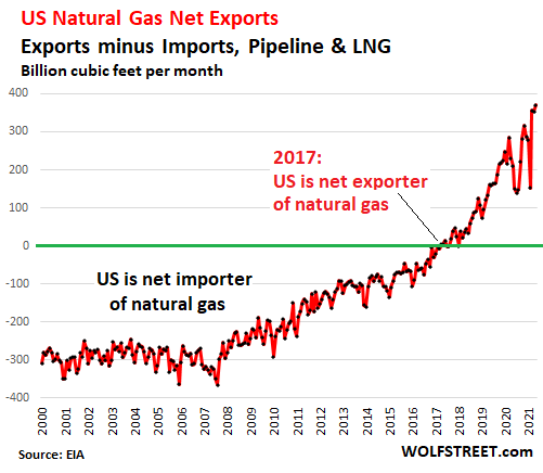 Back in the day, the US produced quite a bit of natural gas, but not enough and had to import large quantities, not only from Canada, but also via LNG, which is much more expensive. Then the fracking boom started, and it did have the effect that the US turned from a large net importer of natural gas into a large net exporter in 2017.