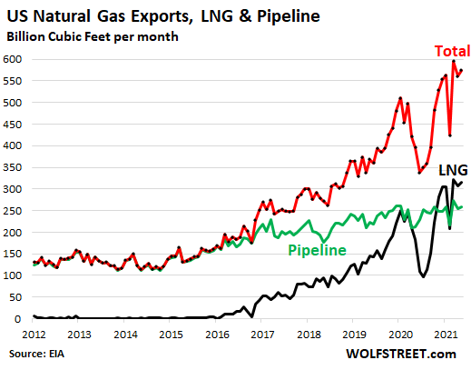 LNG export terminals started to come on line in 2016 and have since then multiplied, and US exports of LNG have boomed, overtaking pipeline exports late last year for the first time. In May, the US exported 315 billion cubic feet of LNG (black line).