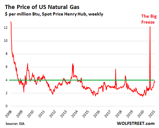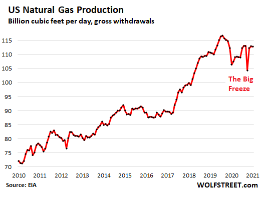 The fracking strategy used to be: Production growth at all costs, no matter what the costs. Over the past 13 years, negative cash flows, losses, and, starting in 2015, bankruptcies piled up as a historic boom in production of crude oil and natural gas caused prices to plunge. But now, after a brutal shake-out in 2020, production of natural gas has remained below peak 2019 levels, even as exports rose. Prices have risen in response, but this time, the rising prices haven’t yet triggered another production boom that would collapse prices once again.