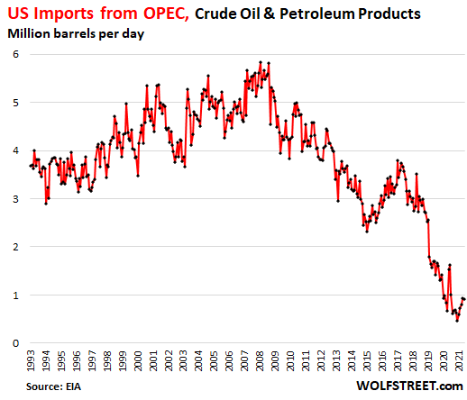 Imports from OPEC started plunging as the fracking boom in the US took off. Back in mid-2008, the US was still importing over 5.5 million barrels per day from OPEC. By November 2020, imports from OPEC had collapsed to 0.5 million barrels per day. In May, imports from OPEC were 0.9 million barrels per day. This range is the lowest in the EIA data going back to 1973:
