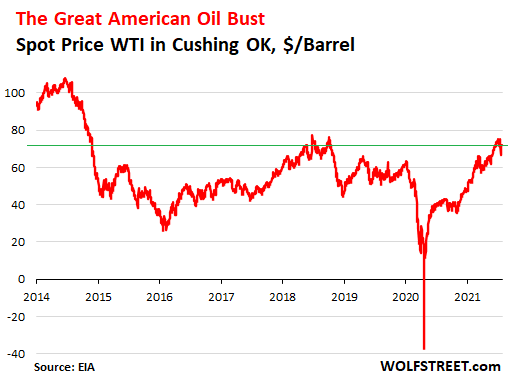 The cutback in production this year – rumored to be due to the newly found “discipline” in the Oil Patch – has reduced overproduction in the US. The price of WTI futures, which had collapsed into the negative for a brief moment in April 2020 for the first time in history, has rocketed higher and has been trading mostly above $70 a barrel since early June ($71.42 at the moment):