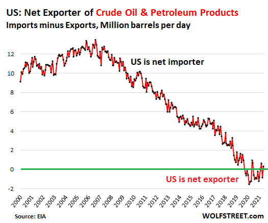 It has since tumbled due to the surge in exports and the plunge in imports, and in October 2019, for the first time, the US exported more than imported. This trend has continued, and the US thereby has become a net exporter of “crude oil & petroleum products.”