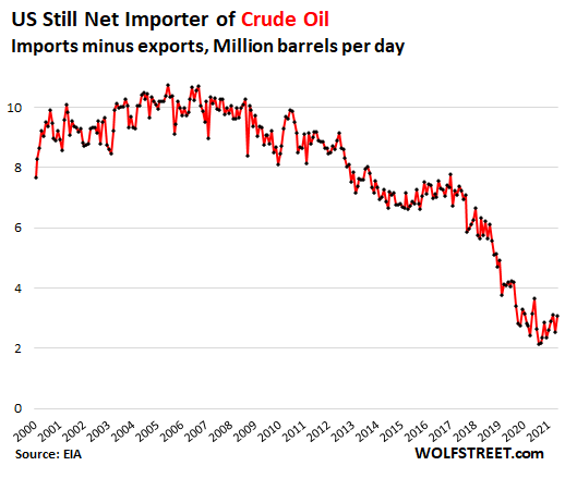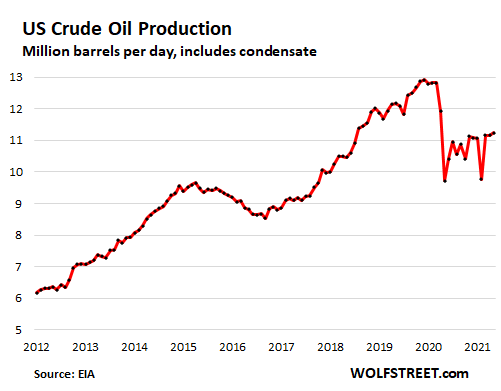 Production of US crude oil, including condensate, in May, at 11.2 million barrels per day, was still down 13% from the peak in late 2019 and back at July 2018 levels, according to EIA data released on Friday. What is fascinating – given how US production doubled over the past decade, reducing US imports from OPEC to nearly nothing (more on that in a moment), crushing the price of oil, and crushing in the process investors in the US oil sector – is how oil drillers in the US, and their battered investors, have refused to raise production back to 2019 levels, despite the recovery in the price of oil.