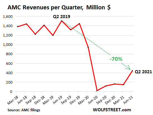 So yes, AMC, reported earnings this afternoon, or rather another huge loss, and revenues surged from near zero in Q2 2020 to $445 million in Q2 this year. But however much “surging” this was doing, thanks to the base effect, meaning that the base of the year-over-year surge was near zero a year ago, revenues were down by over 70% from Q2 2019 ($1.51 billion). This is all that the “pent-up demand” could produce:
