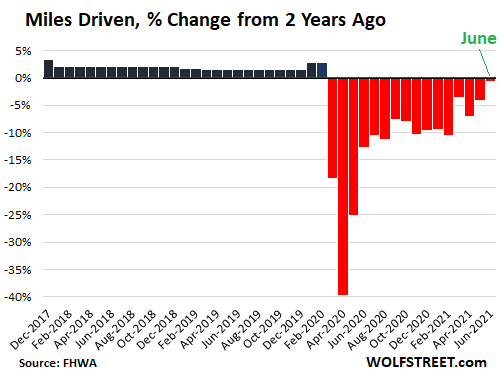 Total miles driven by all types of passenger and commercial vehicles, including over-the-road trucks and local delivery vehicles, in June, on all roads and streets in the US rose to 282.5 billion miles, the highest since October 2019, and just a tad below June 2019, according to the Federal Highway Administration this week. In other words, total miles driven are now roughly back where they were before the pandemic.